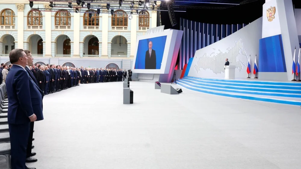 Russian President Vladimir Putin addresses the Federal Assembly, 29 February 2024. Photo: DMITRY ASTAKHOV / SPUTNIK / GOVERNMENT PRESS SERVICE POOL