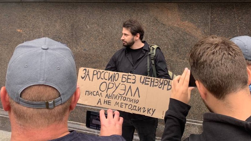 Несмотря на это, сегодня утром они оба пришли к зданию ГД. Кисиев развернул плакат «За Россию без цензуры. Оруэлл писал антиутопию, а не методичку». На месте проведения пикета также появились провокаторы из «Национально-освободительного движения» (НОД).