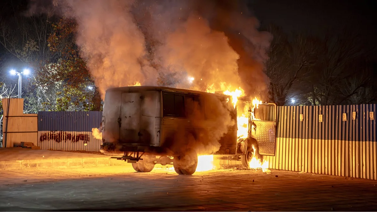 Горящий грузовик во время акций протеста в Тегеране, Иран, 8 января 2026 года. Фото: Khoshiran / MEI / SIPA / Scanpix / LETA