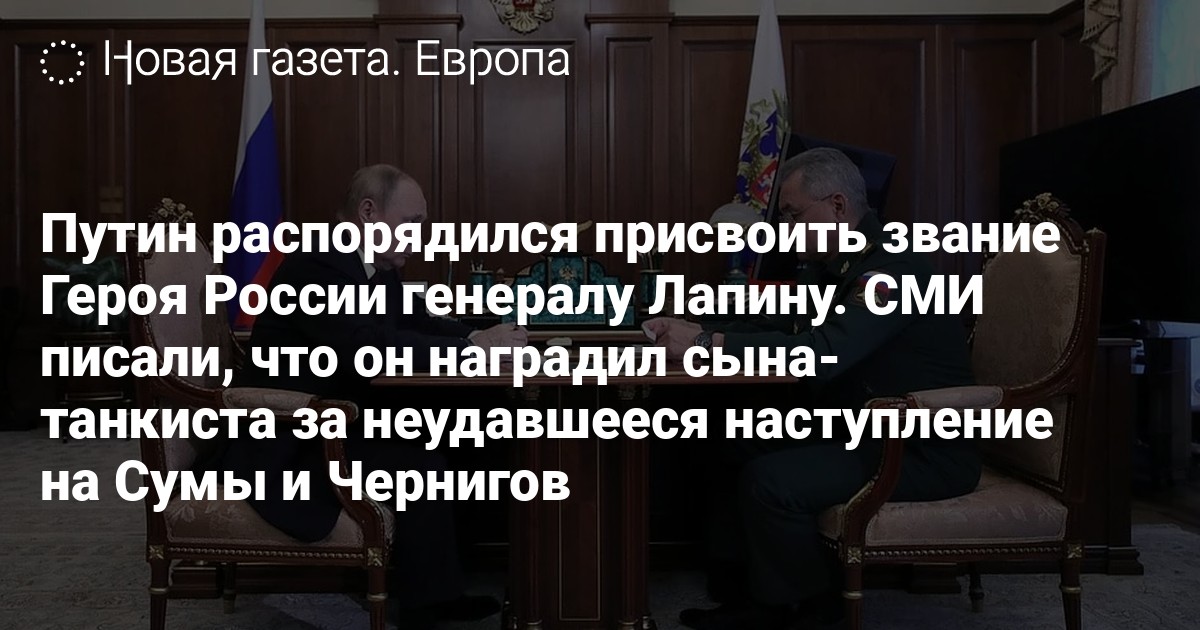Президент России Владимир Путин во время встречи с главой Минобороны РФ Сергеем Шойгу распорядился присвоить звание Героя России командующему группировки «Центр» генерал-полковнику Александру Лапину, а также и заместителю командующего 8-й армией Южного военного округа генерал-майору Эседуллу Абачеву.