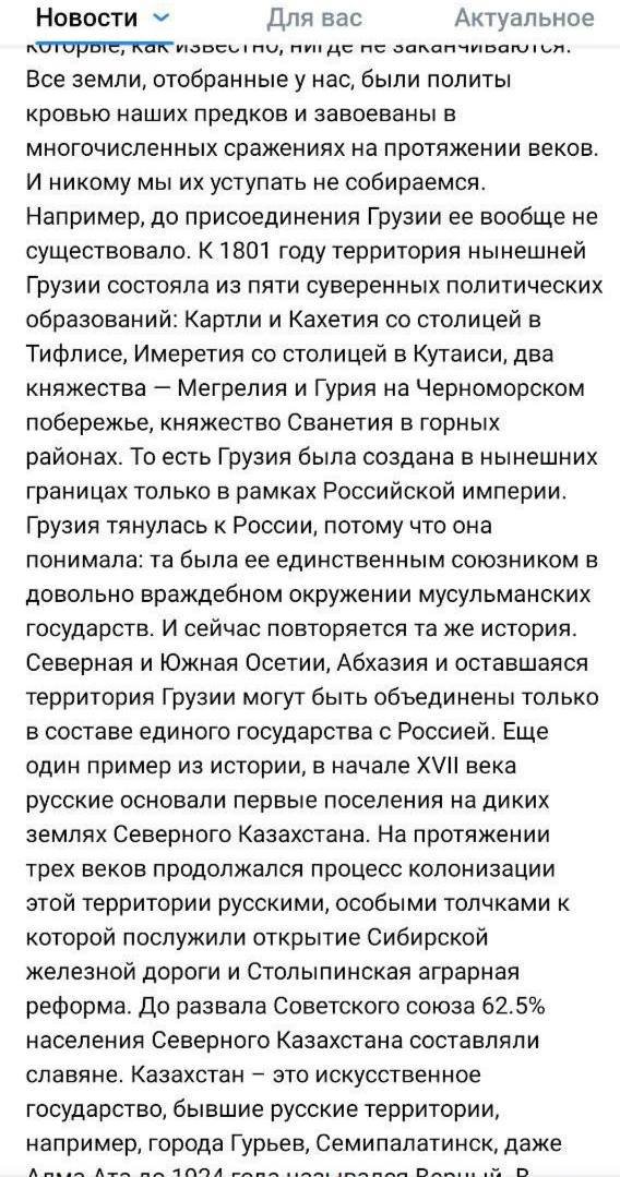 «Казахстан — искусственное государство, бывшие русские территории, например, город Гурьев, Семипалатинск, даже Алма-Ата, до 1924 года она называлась город Верный. В нынешнем веке власти Казахстана начали реализовывать инициативы по переселению внутри республики разных этнических групп, которые можно квалифицировать, как геноцид русских. И мы не намерены закрывать на это глаза. Пока туда не придут русские, порядка не будет», — пишется, например, на странице Медведева.