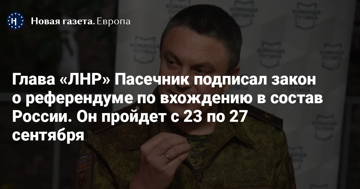 Глава «ЛНР» Пасечник подписал закон о референдуме по вхождению в состав России. Он пройдет с 23 по 27 сентября