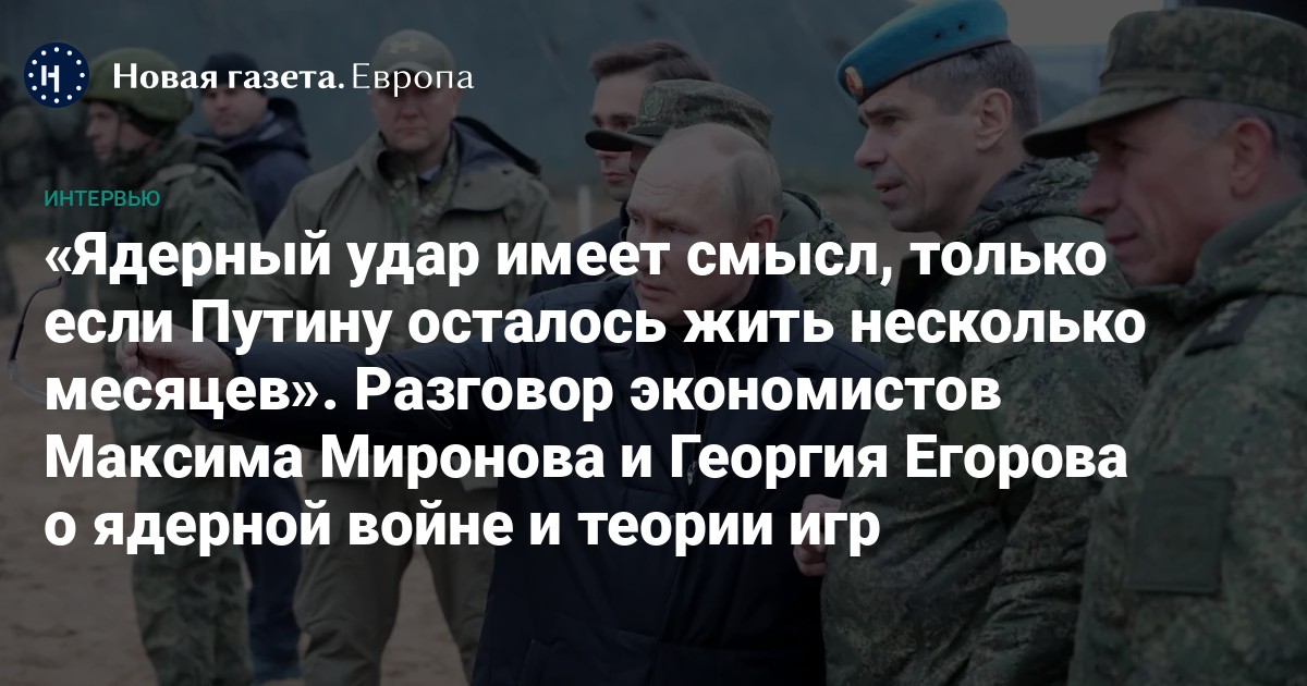 Что делать диктатору, который понял, что проигрывает развязанную войну? Есть ли в этой ситуации рациональные стратегии поведения? И что будет, если Путин всё же нанесет тактический ядерный удар по Украине? Об этом профессор финансов IE Business School Максим Миронов поговорил на своем ютуб-канале с Георгием Егоровым, специалистом по теории игр и профессором Школы управления имени Келлогга в Северо-Западном университете в США. «Новая газета Европа» публикует сокращенную расшифровку этого разговора.