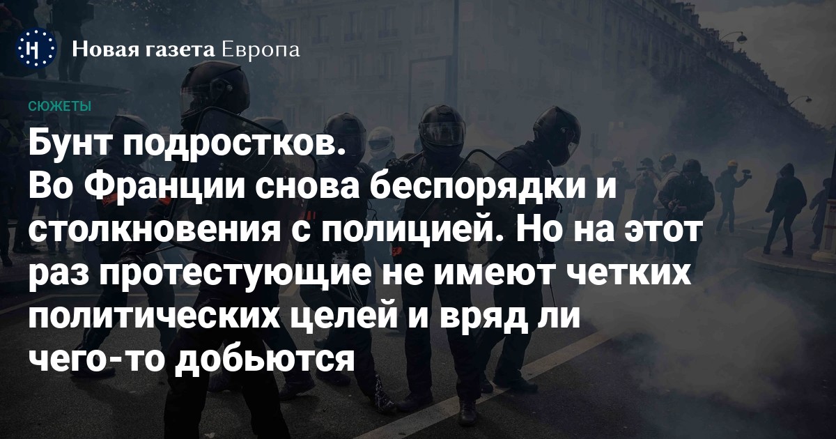 Сцены разбитых витрин и грабежей магазинов во многих французских городах демонстрируют, что группы бунтующих подростков ищут скорее не справедливости, а добычи. После объявленного ареста полицейского, совершившего убийство, новых политических требований протестующими выдвинуто не было. В сущности, к седьмому дню волнений Франция имеет дело не с политическим протестом, а с разгулом уличной преступности, с которой не могут справиться даже 45 000 полицейских, мобилизованных правительством для наведения порядка.