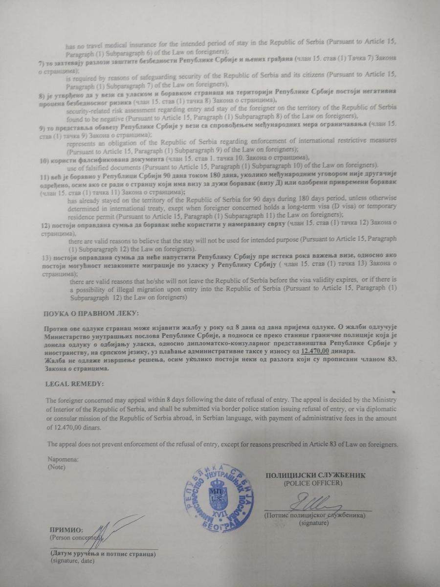 Решение о недопуске в Сербию. Фото: Facebook