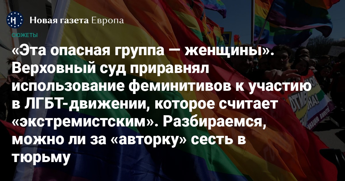 Юрист Максим Оленичев в разговоре с «Новой-Европа» отмечает, что Верховный суд не объявил феминитивы «вне закона»: он лишь указал, что их использование — один из признаков участия в запрещенном «движении ЛГБТ».