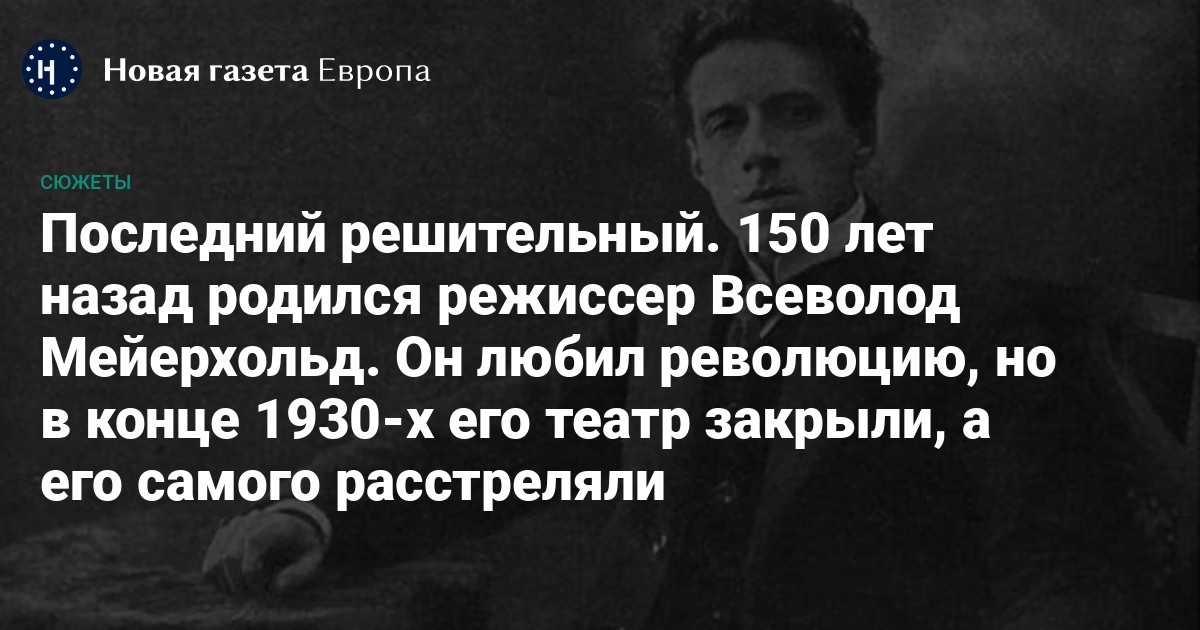 1874-й, 9 февраля*, родился в Пензе. 1898-й, Москва, ученик Немировича, актер Станиславского. 1902-й, уход в режиссуру, самостоятельный театр в Херсоне. 1909-й, режиссер Императорских театров в Петербурге, постановки в Александринском и Мариинском, «Маскарад» Лермонтова. 1917-й, революция, работа с Маяковским. 1920-й, Новороссийск, в плену у белогвардейцев, возвращение в Москву. 1920–1921-й, заведующий Театральным отделом (ТЕО) Наркомата просвещения при Луначарском, революция на сцене, «Театральный октябрь», спектакли-митинги. 1922-й, свадьба с Зинаидой Райх (бывшей женой Есенина), к своей фамилии добавляет ее — становится Мейерхольдом-Райхом. 1925-й, «Ревизор» Гоголя, реформы одного театра и учреждение другого, гастроли в Европе. 1930-й, Михаил Чехов предлагает не возвращаться в СССР, Мейерхольд отвечает: «Вернусь из честности», возвращается. 1934-й, «Дама с камелиями», в главной роли Райх, спектакль не нравится Сталину. 1937-й, статья в «Правде»: «…уход от … действительности, политическое искажение, враждебная клевета на нашу жизнь привели театр к полнейшему идейному и художественному краху. <…> он сделал себя чужеродным телом в организме советского искусства…». 1938-й, Театр Мейерхольда закрыт, Станиславский приглашает Мейерхольда к себе в оперную студию, фактически спасая из опалы, но вскоре умирает, и Мейерхольд остается один. 1939-й, арест в Ленинграде, Зинаиду Райх убивают, Мейерхольда пытают. 2 февраля 1940 года — расстрел.