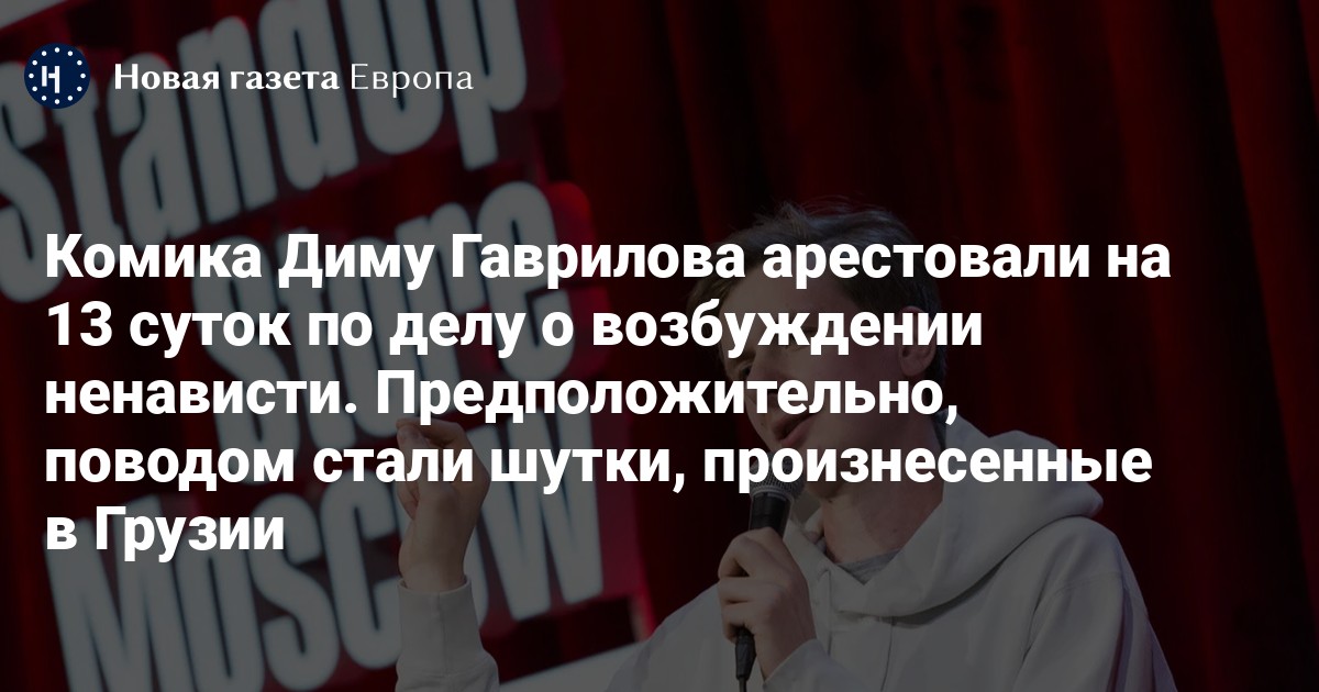 Комика Диму Гаврилова арестовали на 13 суток по делу о возбуждении ненависти. Предположительно, поводом стали шутки, произнесенные в Грузии