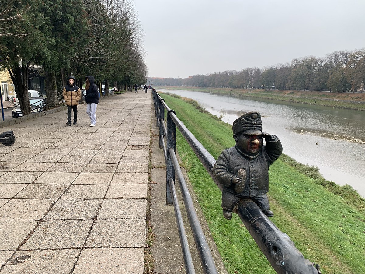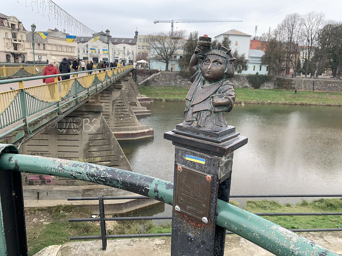 Парни в мультикаме, иные на костылях или на колясках, с азартом исследуют центр Ужгорода. Наводят смартфоны на стрелки с куар-кодами, по-детски радуются, когда находят бронзовые мини-скульптуры, которых уже больше восьми десятков. Скульптуры прячутся в самых живописных и самых неожиданных местах, а размеры их настолько деликатны, что не перегружают городское пространство, где полно настоящих артефактов. Но по этим фигуркам тоже можно знакомиться с историей и культурой края. Бравый солдат Швейк, всемирно известный герой антивоенного романа о Первой мировой; пароход «Карпатия», который первым пришел на помощь терпящему бедствие «Титанику»; перила на набережной реки Уж, завязанные в «Узел Кротона» в честь закарпатского силача, атлета и боксера, известного как Иван Сила, и так дальше.