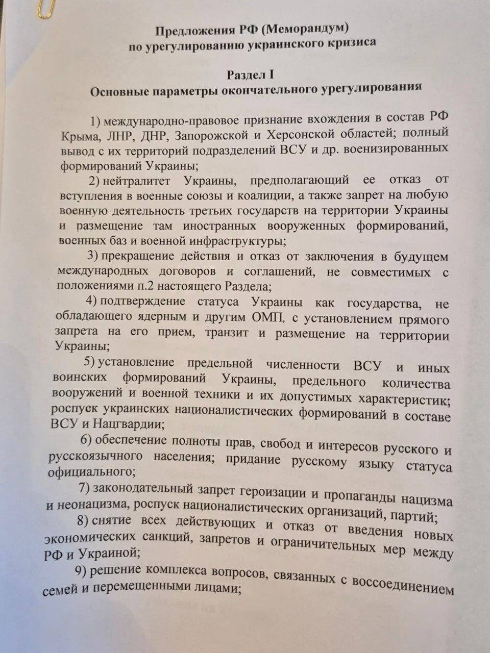 Российские госСМИ опубликовали полный текст меморандума в 19:30 по мск. Российская сторона для «урегулирования украинского кризиса» требует: