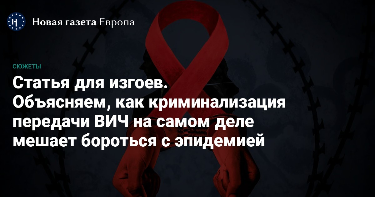 В мае Юлия Разумовская — координаторка петербургского филиала благотворительного фонда «СПИД.ЦЕНТР», основанного журналистом Антоном Красовским, — опубликовала петицию на сайте change.org с требованием пересмотреть статью 122 Уголовного кодекса. Это первая публичная кампания в России, требующая отменить санкции за «заражение другого лица ВИЧ-инфекцией лицом, знавшим о наличии у него этой болезни», а также за «заведомое поставление другого лица в опасность заражения ВИЧ-инфекцией». «Новая-Европа» объясняет, почему криминализация передачи ВИЧ мешает борьбе с эпидемией и как она дискриминирует ВИЧ-положительных людей.