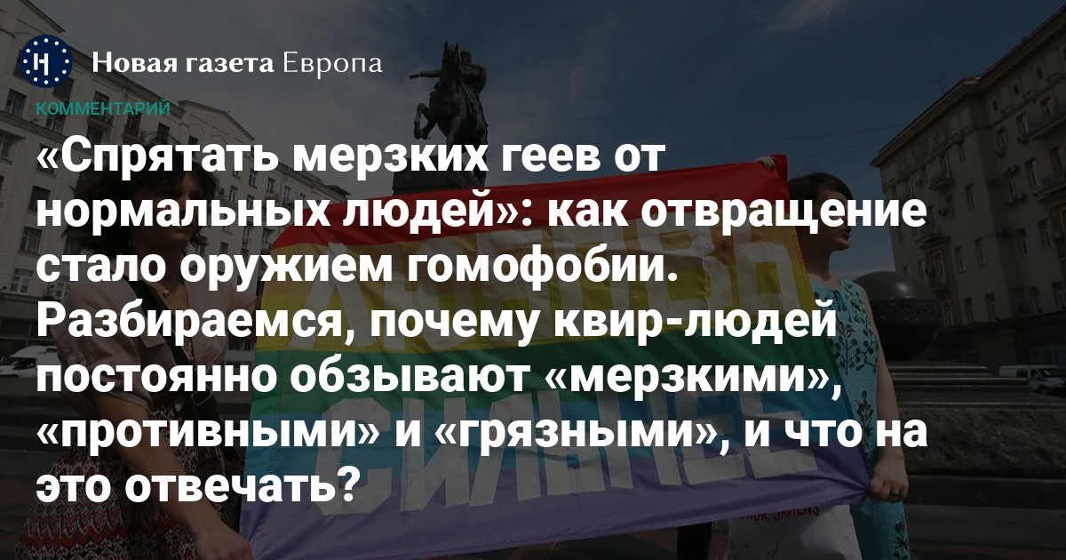 В этом тексте мы разбираем почему именно отвращение так хорошо служит гомофобной пропаганде — и почему все «объективные причины» «спрятать мерзких геев подальше от нормальных людей» на деле не выдерживают никакой критики.