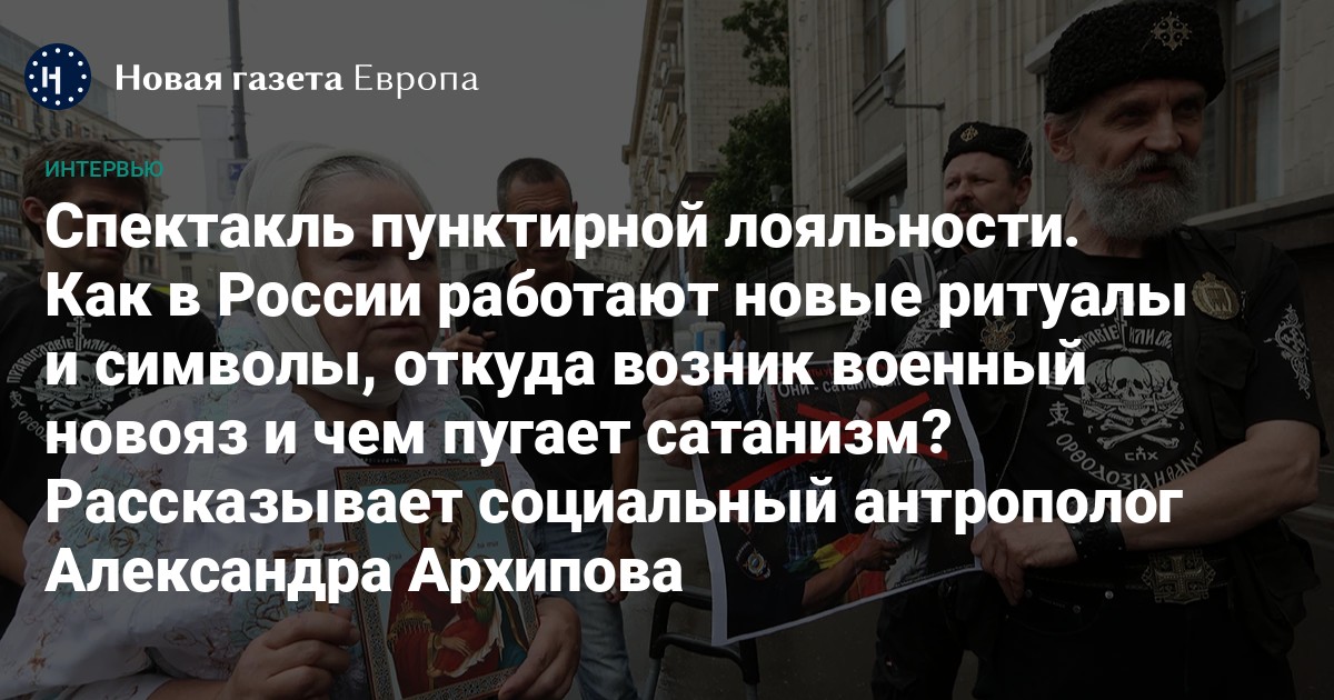 Российская генпрокуратура добилась запрета «международного движения сатанизма» через суд. Еще раньше, в начале года, против сатанистов выступал патриарх РПЦ Кирилл (Гундяев) и сетовал, что западные сатанисты плохо влияют на российскую молодежь. Патриарху, что называется, сам бог велел, но следом подключилась Госдума. Депутат Николай Бурляев, в прошлом — актер, перепугал коллег утверждением, что сатанизм — это даже хуже, чем ЛГБТ, и Дума немедленно начала разрабатывать закон о борьбе с этим опасным явлением. И вот в дело вступила Генпрокуратура. Какие еще процессы — сверхъестественные или противоестественные — запустила в России война? Что происходит в головах у россиян, практикующих новые, связанные с войной, ритуалы? Сами они придумывают эти ритуалы или послушно следуют подсказкам начальства? Об этом «Новая-Европа» спросила социального антрополога Александру Архипову, автора телеграм-канала «(Не)занимательная антропология».