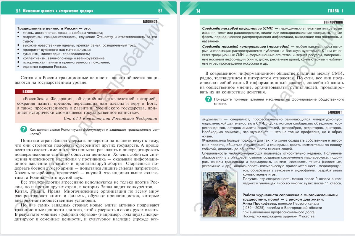 Зато, пока ученик доберется до этого параграфа, ему подробно расскажут про врагов: внутри страны — индивидуалисты, вовне — коварный Запад: «В современных реалиях следует с большой осторожностью относиться к деятельности сообществ, получающих помощь, в том числе финансовую, из-за рубежа. Такие сообщества… на деле нередко служат лишь ширмой для действий государств, враждебных нашему» (с. 39). Эта социальная философия шизоидной подозрительности не получает развития, так как нет никаких пояснений: как же распознать те «редкие случаи», когда зарубежные сообщества не являются таковой ширмой. Дальше пропагандистская слащавость превращается в барабанный бой: «Хочешь добиться снижения численности населения у противника — оказывай информационное давление на семью и пропагандируй аборты… Хочешь завербовать предателей — внушай, что индивид выше коллектива, а Родина — пустой звук» (с. 67).