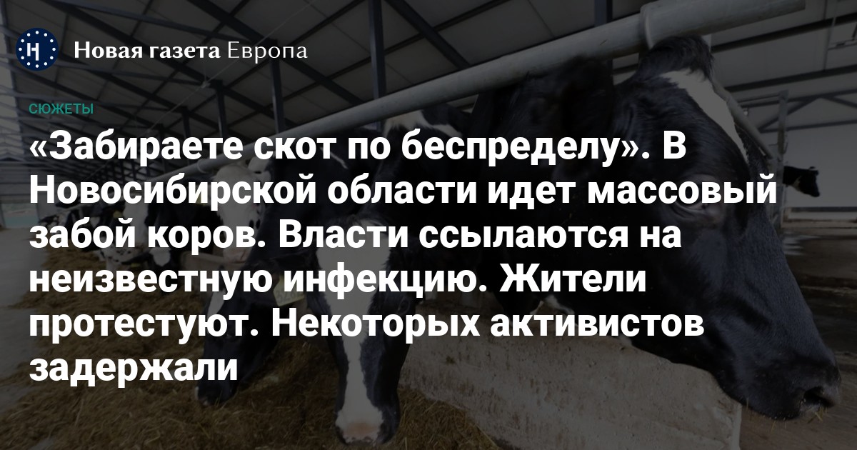 В нескольких селах Новосибирской области идет массовый забой коров. Местные власти утверждают, что в регионе свирепствует инфекция, но что это за болезнь, людям не говорят. Животных у фермеров изымают силой, а часто и в отсутствие хозяев: в селах ввели карантин, жителям запретили вывозить молоко и мясо, выезды из сел заблокировали. Чтобы спасти скот, люди выходят на митинги и записывают видеообращения к президенту. В ответ к селянам и журналистам приходит полиция и наиболее активных задерживает. Издание «Ветер» пообщалось с местными жителями и рассказывает, что происходит под Новосибирском.